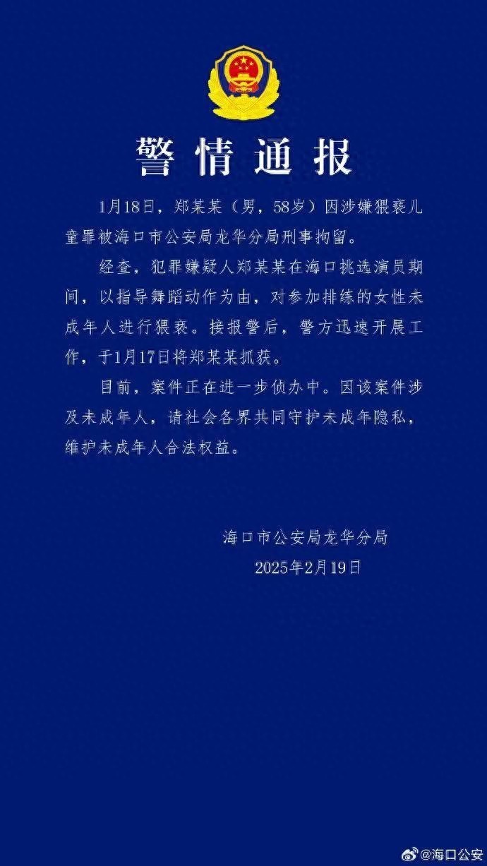 2月19日晚,海口市公安局龙华分局发布通报称,郑某某(男,58岁)因涉嫌猥亵儿童罪被海口市公安局龙华分局刑事拘留。经查,犯罪嫌疑人郑某某在海口挑选演员期间,以指导舞蹈动作为由,对参加排练的女性未成年人进行猥亵。接报警后,警方迅速开展工作,于1月17日将郑某某抓获。目前,案件正在进一步侦办中。